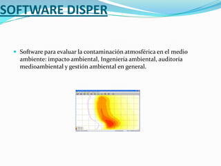 Este documento describe brevemente cuatro software diseñados para evaluar diferentes tipos de contaminación ambiental: el software DISPER para evaluar la contaminación atmosférica, el software DESCAR para evaluar la dispersión de contaminantes en el agua, el software RADIA para evaluar la contaminación electromagnética producida por estaciones base de telefonía móvil, y el software CUSTIC para evaluar la contaminación sonora y el ruido.
