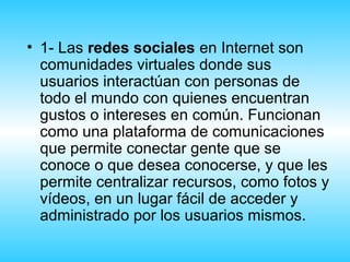 Las redes sociales permiten a los usuarios conectarse con otras personas con intereses similares de todo el mundo. Pueden ser horizontales, dirigidas a todo tipo de usuario sin un tema definido, o verticales, enfocadas en un tema o industria específicos. Aunque las redes sociales tienen beneficios como mantener a los estudiantes informados, también conllevan riesgos como el phishing, malware y suplantación de identidad.