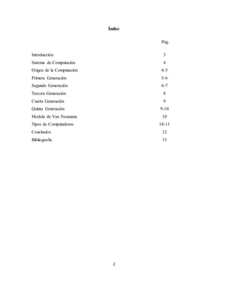 Este documento describe la historia y evolución de las computadoras desde sus orígenes hasta la quinta generación. Comienza con dispositivos mecánicos como el ábaco y la máquina analítica de Charles Babbage. Luego pasa a las primeras computadoras electrónicas como la ENIAC y EDVAC. Divide la historia en generaciones definidas por los componentes y lenguajes de programación utilizados, culminando en computadoras más pequeñas, baratas y universales.