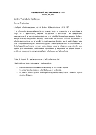 La estudiante Viviana Dalila Díaz Banegas de la carrera de Arquitectura pregunta sobre la relación entre la gestión del conocimiento y la Web 2.0. La gestión del conocimiento se ocupa de identificar, capturar, recuperar y evaluar el conocimiento organizacional almacenado por las personas basado en su experiencia o aprendizaje. La Web 2.0 permite compartir información y conocimiento, lo que activa la gestión del conocimiento para entender lo compartido, comparado, aprendido y mejorado. La gestión del conocimiento siempre estará relacion