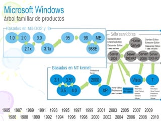El documento resume brevemente la historia de los sistemas operativos Windows, Mac OS y Linux. Detalla las versiones clave de Windows desde 1985 hasta 2009, con énfasis en las mejoras de interfaz de usuario e integración de hardware. También resume las versiones principales de Mac OS desde 1984 hasta 2009, destacando las nuevas características como Spotlight, Dashboard y mejoras de accesibilidad.