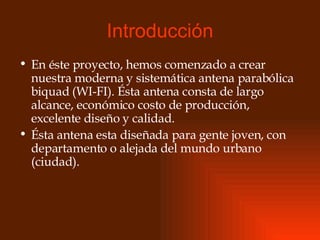 El documento describe un proyecto para crear una antena parabólica Wi-Fi de largo alcance y bajo costo para personas que viven lejos de áreas urbanas. La antena tendrá un diseño moderno y sistemático y proporcionará una conexión rápida, óptima y segura a Internet para múltiples usuarios compartiendo un ancho de banda.