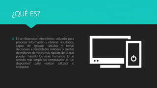 El documento proporciona información sobre la historia y componentes de los computadores. Explica que un computador es un dispositivo electrónico que procesa información de forma rápida para realizar cálculos y tomar decisiones. Está formado por hardware físico y software de programas e instrucciones. Los primeros computadores analógicos y digitales se desarrollaron en el siglo XX para realizar cálculos, y los primeros modelos comerciales utilizaban tarjetas perforadas. La invención del microprocesador en 1971 revolucionó la industria y condu