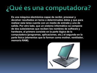 Una computadora es una máquina electrónica capaz de recibir, procesar y devolver resultados sobre datos mediante un medio de entrada y salida. Está compuesta de hardware, la parte física como la tarjeta madre, y software, la parte lógica como programas y aplicaciones. La tarjeta madre contiene el CPU, memoria y puertos para conectar periféricos.