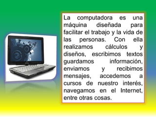 Una computadora es un mecanismo electrónico que acepta información de entrada, la procesa y produce información de salida. Es una máquina diseñada para facilitar el trabajo y la vida de las personas mediante el cálculo, procesamiento de textos, almacenamiento de información y acceso a Internet, entre otras funciones. Está compuesta de hardware físico como la unidad central de procesamiento, monitor y dispositivos de entrada y salida, así como software que permite a la computadora realizar tareas a través de programas e instrucciones.