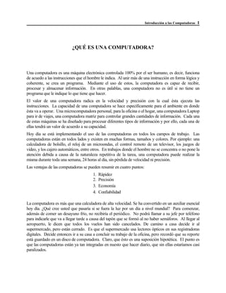 El documento describe las funciones básicas de una computadora en 3 oraciones: 1) Una computadora tiene tres funciones principales: entrada de datos, procesamiento y salida de información. 2) La unidad central de procesamiento es el cerebro de la computadora y se encarga de realizar acciones como calcular, almacenar y comparar datos. 3) La memoria es donde se guardan las instrucciones, programas y datos de la computadora y existe en diferentes tipos como la RAM y la ROM.