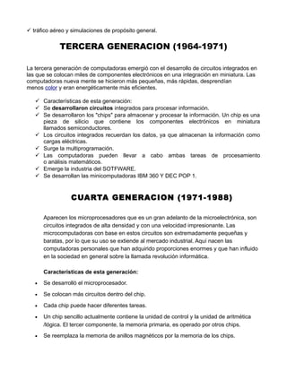 La evolución de la computadora comenzó en 1642 con la invención de la máquina de Pascal para sumar y multiplicar números. Las primeras generaciones de computadoras desde 1951 hasta 1971 se hicieron más pequeñas, rápidas y eficientes a medida que se pasó de tubos de vacío a transistores y luego a circuitos integrados. La cuarta generación desde 1971 hasta 1988 vio el surgimiento de los microprocesadores y las computadoras personales. La quinta generación desde 1983 hasta el presente ha continuado mejorando el software y sistemas para hacer las computador