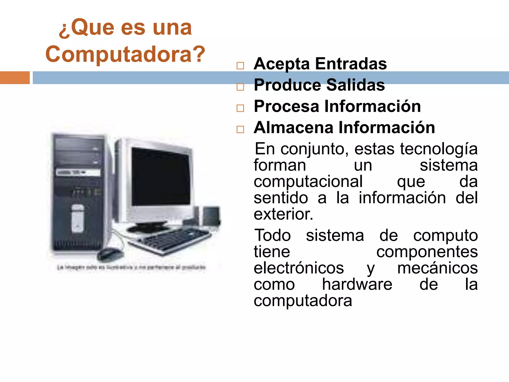 Una computadora acepta entradas, procesa y almacena información para producir salidas. Existen diferentes tipos de computadoras diseñadas para tareas específicas como computadoras personales, handheld, estaciones de trabajo, consolas de videojuegos, mainframes y supercomputadoras. Las computadoras tienen limitaciones como no poder pensar por sí mismas o tomar decisiones sin intervención humana, pero son útiles para almacenar grandes volúmenes de datos, procesar información rápidamente y representar números gráficamente.