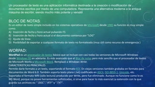 El documento describe varios procesadores de texto, incluyendo Bloc de Notas, WordPad, Lotus Word Pro, WordPerfect y Microsoft Word. Bloc de Notas y WordPad son procesadores de texto básicos incluidos con Windows, mientras que Lotus Word Pro, WordPerfect y Microsoft Word son aplicaciones más avanzadas con características sofisticadas para la edición y formato de documentos.