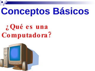 Una computadora es una máquina electrónica que procesa datos a gran velocidad, aceptando datos de entrada, procesándolos y produciendo información de salida. El hardware son los componentes físicos de una computadora y sus periféricos, mientras que el software son los programas y datos procesados por el hardware. Los periféricos son dispositivos adicionales necesarios y pueden ser de entrada, como teclados y mouse; de salida, como monitores e impresoras; o de entrada y salida, como discos duros.