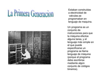 El documento describe la evolución de las computadoras a través de las generaciones, desde las primeras computadoras de válvulas programadas en lenguaje de máquina hasta las computadoras personales basadas en microprocesadores y lenguajes de alto nivel en la cuarta generación. También menciona el proyecto japonés de la quinta generación que buscaba desarrollar computadoras con inteligencia artificial.