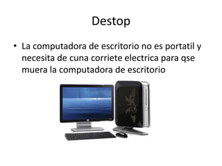 Las computadoras de escritorio, laptops y tablets son dispositivos electrónicos que permiten realizar tareas de trabajo. Las computadoras de escritorio no son portátiles y requieren una fuente de energía, mientras que las laptops y tablets son portátiles y permiten realizar trabajos y presentaciones desde cualquier lugar.