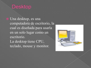 Una desktop, laptop y tablet son computadoras que contienen CPU, monitor, teclado y mouse. La diferencia es que la desktop solo se puede usar en un lugar, mientras que la laptop y tablet son portátiles y se pueden mover. Otra diferencia es que la tablet tiene una pantalla táctil que se puede usar con los dedos.