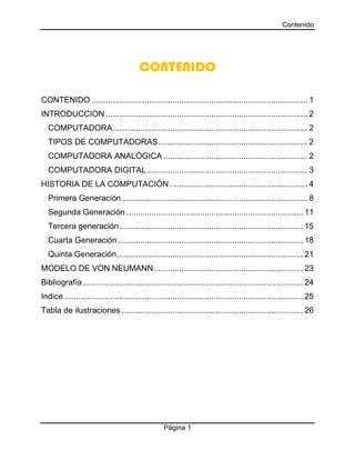 El documento proporciona una historia de las computadoras desde sus orígenes hasta la quinta generación. Comenzó con dispositivos mecánicos como el ábaco y la máquina analítica de Charles Babbage en el siglo XIX. La primera computadora electrónica fue la ENIAC en 1947, seguida por la EDVAC que introdujo el modelo de von Neumann de almacenar instrucciones y datos en la misma memoria. La primera generación de computadoras en los años 50 usó tubos de vacío y lenguaje de máquina, mientras que la segunda en