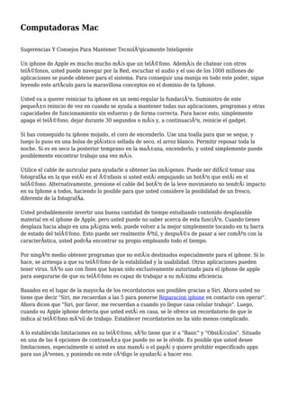 El documento proporciona consejos y sugerencias para optimizar el uso del iPhone de Apple, como reiniciar el dispositivo regularmente, manejar su funcionamiento en caso de mojarse y utilizar Siri para establecer recordatorios. También se menciona la importancia de descargar aplicaciones autorizadas para evitar problemas de estabilidad y la manera de guardar imágenes de manera sencilla. Finalmente, se resaltan funciones útiles como la gestión de administración del tiempo y el entretenimiento educativo para los niños.