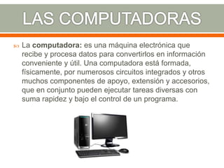 La computadora es una máquina electrónica que recibe y procesa datos para convertirlos en información útil. Una computadora portátil es un tipo de computadora personal que puede ser transportada y usada en diferentes lugares debido a su tamaño y peso reducidos. Las computadoras portátiles se han vuelto muy populares desde la década de 1990 y ahora superan las ventas de las computadoras de escritorio.