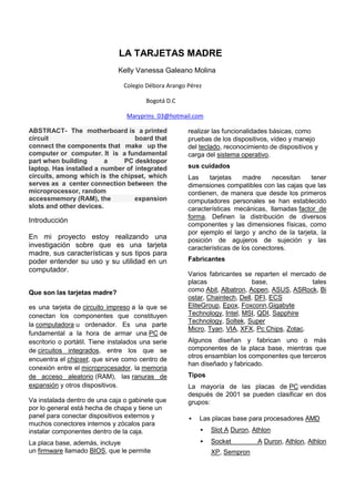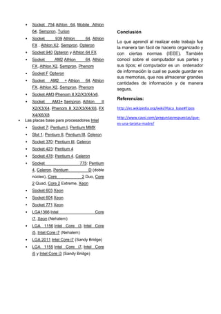 La tarjeta madre es una placa de circuito impreso fundamental para un computador que conecta los componentes principales como el microprocesador, memoria RAM y ranuras de expansión. Existen diferentes tipos de tarjetas madres compatibles con procesadores AMD o Intel que se distinguen por el zócalo del microprocesador. La tarjeta incluye un chipset y BIOS para funciones básicas del sistema.