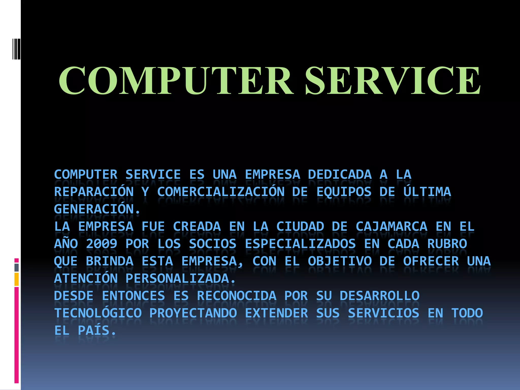 COMPUTER SERVICE es una empresa peruana dedicada a la reparación y venta de equipos de computación fundada en 2009 en Cajamarca. Ofrece servicios como ensamblaje, detección de fallas, formateo e instalación de programas, reparación de accesorios e instalación de redes, así como la venta de programas, teclados, monitores, mouse, parlantes y CPUs. La empresa busca expandirse a nivel nacional y ser líder en el sector de tecnología a través de una atención de calidad.