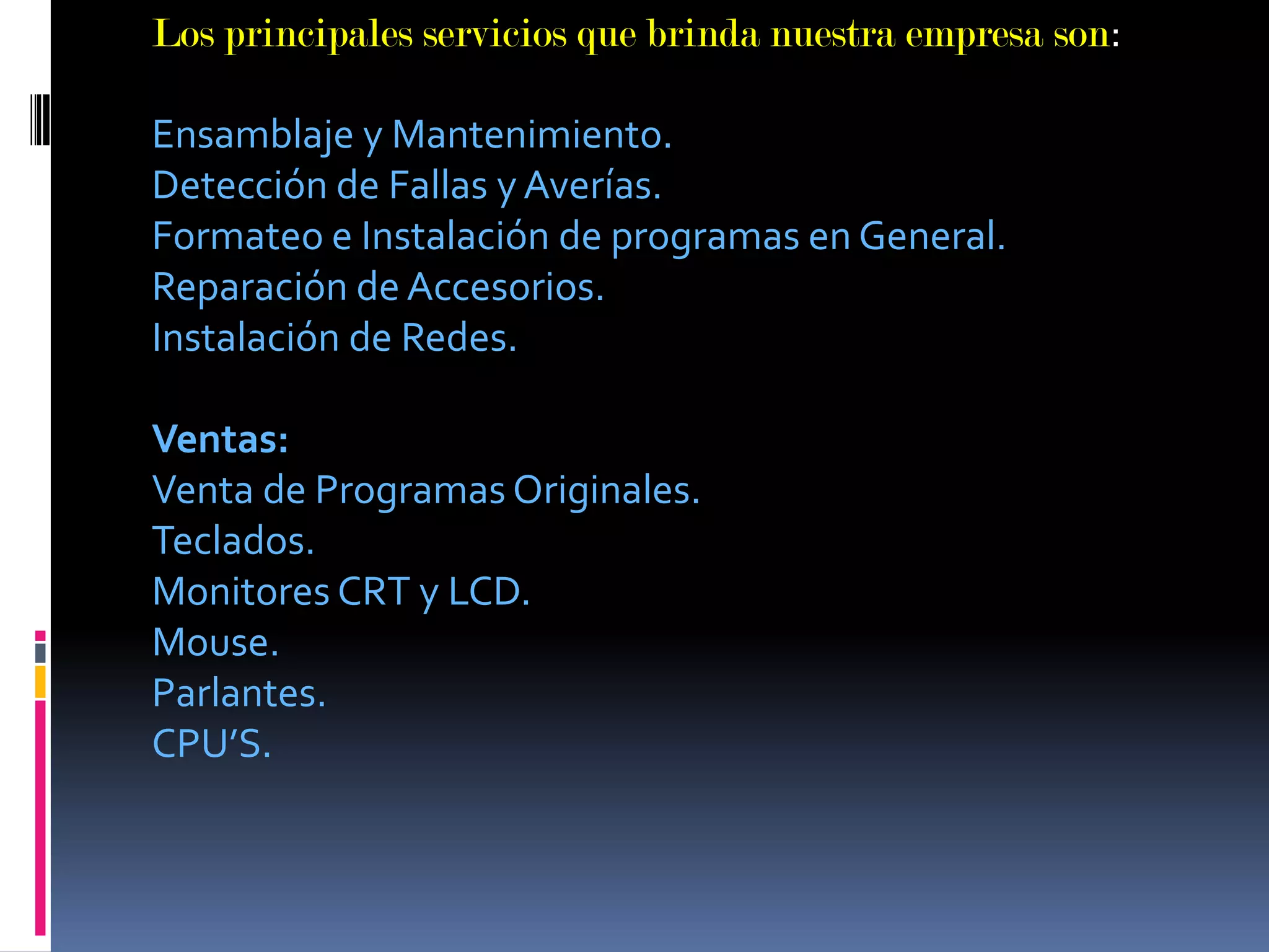 COMPUTER SERVICE es una empresa peruana dedicada a la reparación y venta de equipos de computación fundada en 2009 en Cajamarca. Ofrece servicios como ensamblaje, detección de fallas, formateo e instalación de programas, reparación de accesorios e instalación de redes. Su objetivo es brindar una atención de calidad y expandirse a nivel nacional e internacional.