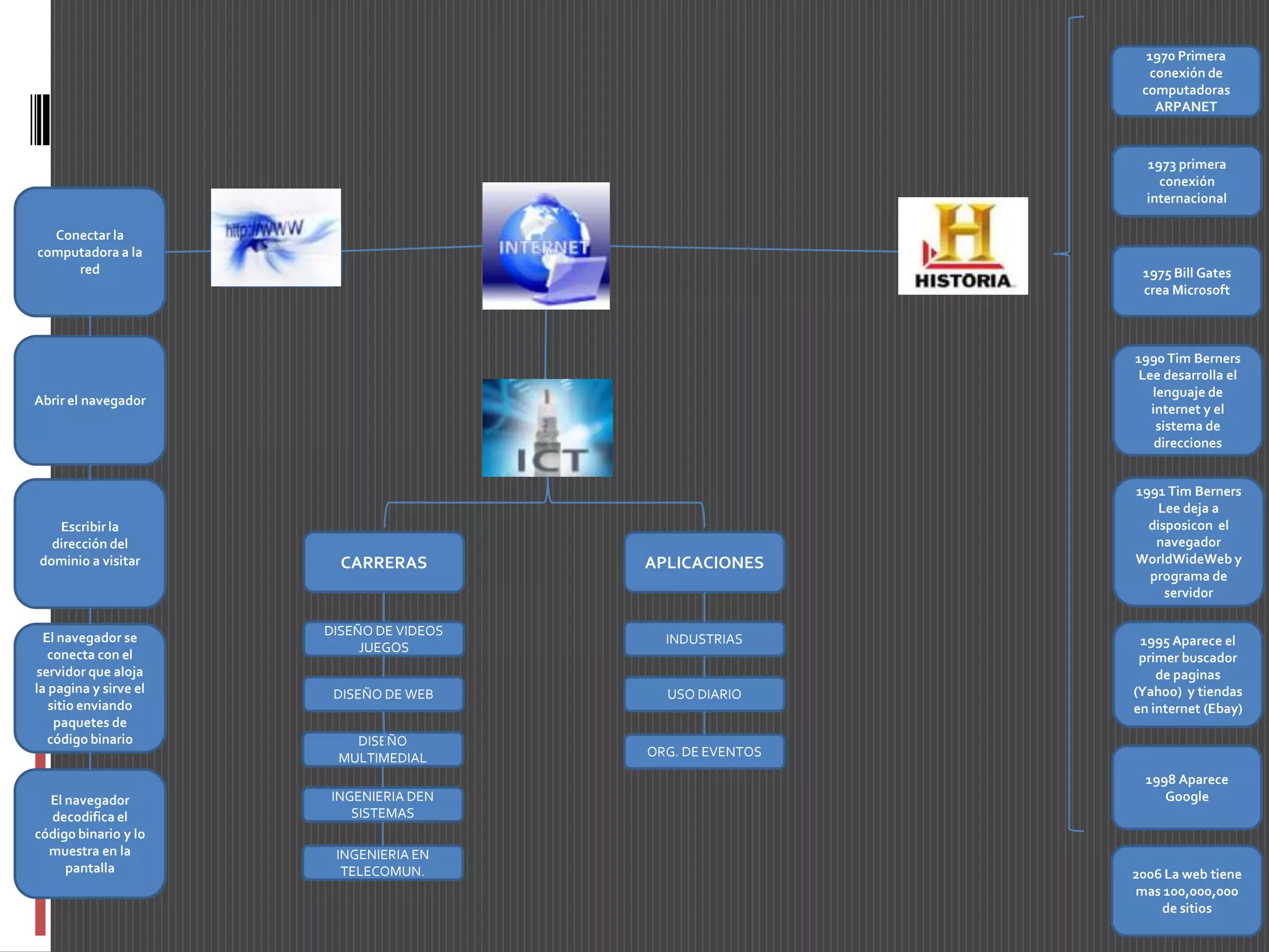 El documento resume los hitos clave en el desarrollo de Internet y la web, incluyendo la primera conexión de ARPANET en 1970, el desarrollo del lenguaje HTML y el navegador World Wide Web por Tim Berners-Lee en 1990-1991, y el surgimiento de los primeros buscadores como Yahoo en 1995 y Google en 1998.