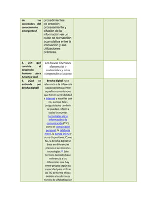 Este documento resume varios conceptos clave relacionados con las sociedades del conocimiento y el papel de la tecnología educativa. Explica la diferencia entre sociedades de la información y sociedades del conocimiento, el enfoque de Amartya Sen sobre el desarrollo humano, y los objetivos de la formación de docentes en el uso de TIC. También define conceptos como brecha digital, medios de enseñanza, e-learning y competencias digitales, resaltando la importancia de desarrollar estas habilidades para la educación.
