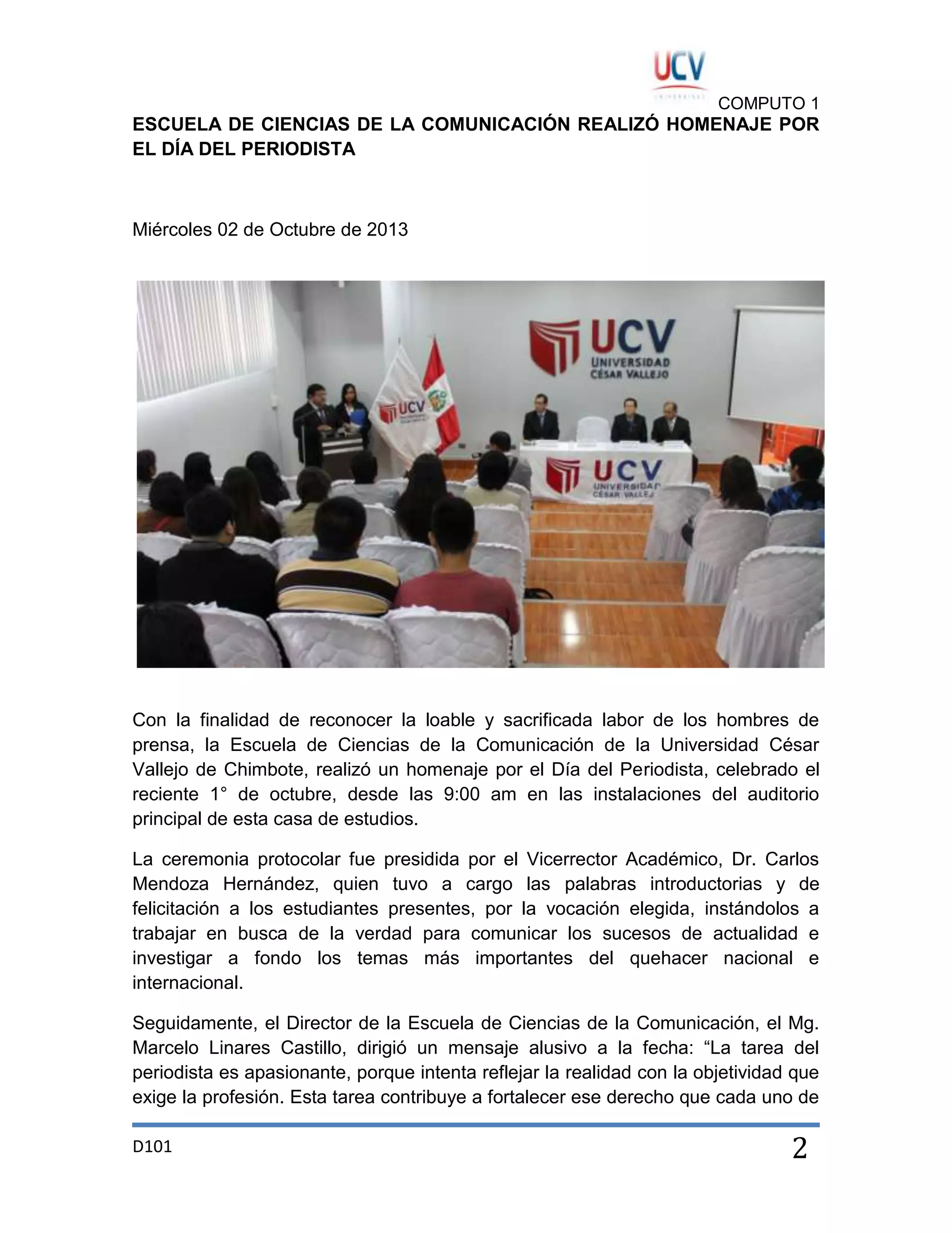 El documento habla sobre un homenaje realizado por la Escuela de Ciencias de la Comunicación de la Universidad César Vallejo de Chimbote por el Día del Periodista. El evento contó con la presencia del Vicerrector y Director de la Escuela, quienes ofrecieron palabras de felicitación. También se dictaron conferencias sobre temas de comunicación y por último se realizó un brindis en honor a la fecha.