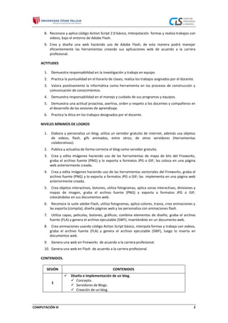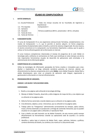 Este sílabo describe un curso de Computación III que enseña el diseño y desarrollo de aplicaciones web integrales usando programas como Adobe Fireworks, Adobe Flash, Camtasia Studio y Adobe Dreamweaver. El curso se divide en dos unidades, la primera sobre blogs, imágenes y animaciones, y la segunda sobre videos, sitios web y publicación en internet. El curso evalúa el progreso de los estudiantes a través de proyectos y exámenes parciales.