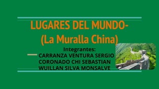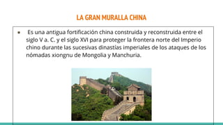 La Gran Muralla China se construyó entre los siglos V a.C. y XVI d.C. para proteger el norte de China de los ataques de los nómadas. Mide más de 6,700 km de largo y fue construida por millones de trabajadores a lo largo de dinastías sucesivas, aunque muchos murieron en el proceso. Aún se conservan secciones y es un símbolo emblemático de China.
