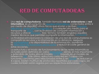 Este documento describe conceptos básicos sobre Internet y redes de computadoras. Explica que una red informática es un conjunto de equipos conectados que comparten información y recursos. También describe los tipos de redes como las redes locales (LAN) y las redes de área amplia (WAN), así como conceptos como protocolos, topologías, arquitecturas cliente-servidor e Internet.