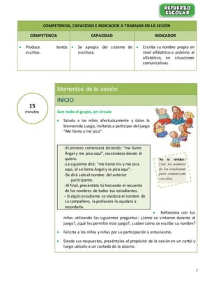 Este documento presenta una sesión de primer grado sobre la presentación de los estudiantes de manera divertida y el aprendizaje de sus nombres. La sesión incluye juegos para que los estudiantes aprendan los nombres de sus compañeros y practiquen la escritura de sus propios nombres. El objetivo es que los estudiantes se familiaricen con sus nombres y los puedan reconocer y escribir.