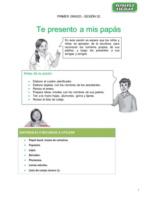 El documento presenta una sesión de primer grado sobre la enseñanza de la escritura de los nombres de los padres. Los niños aprenderán a escribir los nombres de sus padres usando letras móviles y luego presentarán a sus padres llenando una ficha con sus nombres. La sesión incluye actividades grupales e individuales para practicar la escritura de los nombres siguiendo las normas de convivencia.