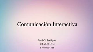 El documento habla sobre la comunicación interactiva y cómo ha traspasado la vida cotidiana del hombre a través del desarrollo tecnológico. Explica que la comunicación interactiva permite al receptor influir en el flujo de información dependiendo de la estructuración de la misma. También describe brevemente la evolución de la web 1.0 a la 3.0 y conceptos clave como hipertexto, multimedia, buscadores y redes sociales.