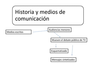Este documento describe la evolución histórica de la comunicación política y los medios de comunicación. Comenzó en la década de 1950 con el surgimiento de la televisión como principal fuente de noticias políticas. Esto marcó el inicio de una "democracia de medios" donde la política se comunica al público a través de los medios. En la década de 1990, Internet trajo nuevos cambios a la naturaleza de la comunicación política. Hoy en día, los medios de comunicación, especialmente la televisión y las redes, tienen una gran influencia