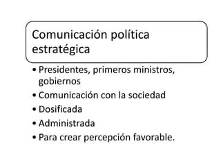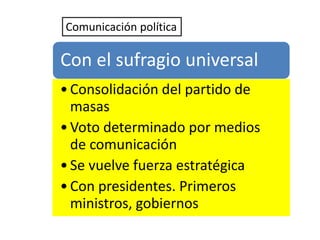 Este documento describe la evolución de la comunicación política y su estudio académico desde principios del siglo XX hasta la década de 1980. Se destaca el crecimiento de la influencia de los medios de comunicación masiva como la radio y la televisión en la política, y el desarrollo de la comunicación política como campo de estudio, particularmente en Estados Unidos. También se analizan diferentes paradigmas y enfoques teóricos sobre los efectos de los medios en la opinión pública y el comportamiento político.