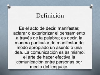 La comunicación es el acto de expresar pensamientos y transmitir información a través del lenguaje. Existen dos vertientes principales de la comunicación: la comunicación escrita, que transmite mensajes de manera formal a través de signos lingüísticos en textos, y la comunicación oral, que es espontánea y directa a través del habla e incluye gestos y expresiones no verbales. Un buen dominio del lenguaje permite comunicarse de manera clara y eficaz en diferentes contextos.
