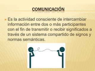 La comunicación es el intercambio consciente de información entre dos o más participantes a través de un sistema compartido de signos y normas. Los propósitos de la comunicación incluyen informar, entretener y persuadir. Algunos propósitos específicos de informar son explicar, describir, definir y exponer, mientras que los propósitos específicos de persuadir son motivar a la acción, convencer o formar opiniones, reforzar creencias existentes, y cambiar actitudes u opiniones.