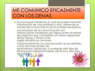Este documento describe las técnicas de comunicación eficaz, incluyendo la escucha activa. La escucha activa implica comprender plenamente lo que dice el otro mediante la repetición de sus palabras clave, sin juzgar. Algunos elementos que facilitan la escucha activa son mostrar empatía, parafrasear y dar cumplidos. La comunicación eficaz se produce cuando el receptor interpreta correctamente el mensaje del emisor.