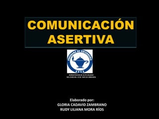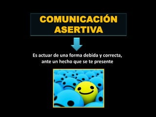 Este documento trata sobre la comunicación asertiva. En 3 oraciones: La comunicación asertiva implica expresar lo que se piensa y opina sin temor a represalias pero de forma educada y respetuosa. Se basa en ser claro, contundente y directo para que el mensaje sea entendido y aceptado. Incluye un ejemplo de cómo actuar de forma asertiva ante una situación en la que se pide un café caliente pero llega frío, pidiendo amablemente que lo cambien.