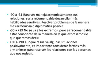 El documento presenta un inventario de asertividad de Rathus que evalúa en una escala de -3 a +3 qué tan característico son ciertas frases de la persona. Explica que puntajes entre -90 y -31 indican bajas habilidades asertivas, entre -30 y +29 son moderadas y entre +30 y +90 se deben considerar formas más armoniosas de relacionarse. También define la asertividad y sus ventajas sobre la pasividad y agresividad, e incluye técnicas verbales asertivas como "
