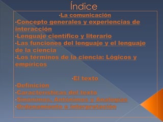 Este documento trata sobre diferentes temas relacionados con la comunicación y el lenguaje como niveles de significación de textos, tipos de lectura, estructura de textos científicos, funciones del lenguaje, tipología textual y enfoque estratégico.