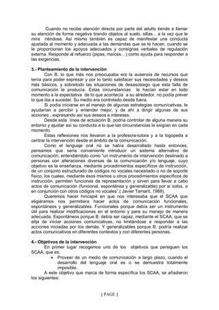 Este documento describe el uso del sistema de comunicación PECS (Picture Exchange Communication System) con un estudiante llamado B. que no tiene lenguaje oral debido a un trastorno generalizado del desarrollo. El objetivo del uso de PECS era proporcionar a B. una forma de comunicación y regular su conducta disruptiva. PECS involucra el intercambio de tarjetas con imágenes para hacer peticiones. Tras implementar PECS, la conducta de B. mejoró a medida que podía comunicar mejor sus necesidades.