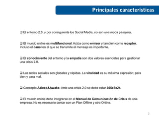 Este documento proporciona consejos sobre cómo gestionar una crisis en las redes sociales. Enfatiza la importancia de estar activo en línea antes de una crisis para establecer credibilidad, monitorear conversaciones para comprender la percepción pública, y tener un plan para responder rápidamente con transparencia y voluntad de diálogo para minimizar el impacto negativo.