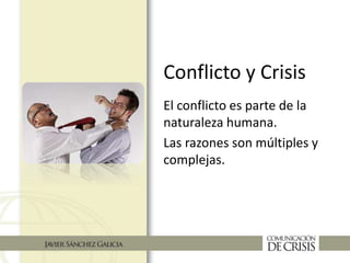 El documento analiza la naturaleza del conflicto y crisis, destacando que son parte de la experiencia humana, influenciados por la lucha por el poder y las diferencias entre actores. Se describen los tipos de crisis, sus fases, y la importancia de una comunicación efectiva para manejar estas situaciones, así como los principios y estrategias para enfrentarlas. Se distingue entre varios niveles de crisis y resalta el papel del 'war room' y la célula de crisis, enfatizando en la necesidad del control de daños y la adecuada interacción con los medios.
