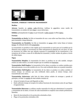 Este documento describe los conceptos básicos de la comunicación de datos, incluyendo los elementos necesarios como el emisor, receptor y medio. Explica los diferentes tipos de transmisión como asíncrona, síncrona, simplex, half-duplex y full-duplex. También resume los protocolos OSI e IEEE y los diferentes niveles de comunicación, así como conceptos clave sobre redes, interfaces y modems.