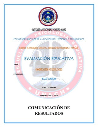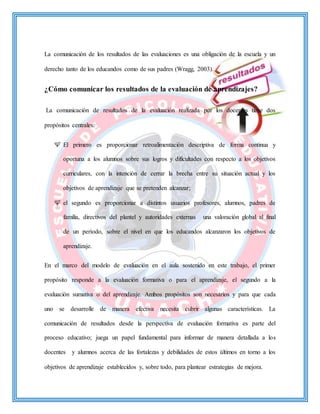 La comunicación de los resultados de la evaluación es un derecho de los estudiantes y sus padres. Existen dos propósitos para comunicar los resultados: proporcionar retroalimentación continua para mejorar el aprendizaje, y proveer una valoración global al final del período. Para que la comunicación sea efectiva, se debe compartir los objetivos de evaluación, establecer criterios claros, proveer información precisa y oportuna, y asegurar que la retroalimentación sea constructiva y respetuosa.