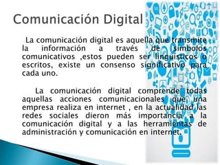 El documento trata sobre varios temas relacionados con la comunicación digital. Explica conceptos como redes sociales, blogs, hipertexto, multimedia, entre otros. También define formatos de imágenes como JPEG y PNG, y tipos de contenido digital como podcasts y wikis.