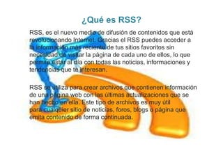RSS permite que los usuarios accedan a las actualizaciones más recientes de sus sitios web favoritos de manera automática y sin necesidad de visitar cada sitio individualmente. Los lectores RSS centralizan esta información de diferentes fuentes en un solo lugar para que los usuarios puedan mantenerse al día de manera más rápida y eficiente. Algunos lectores populares son Feedreader, RSSreader y Newsmonster para ordenadores, y Netvibes y Google Reader para lectura en línea.