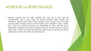El documento habla sobre el mal uso que algunos usuarios dan a las redes sociales y la necesidad de que estas plataformas ofrezcan más tutoriales y ayuda para educar a los usuarios sobre cómo usarlas de forma apropiada para comunicación y compartir contenido en lugar de publicar cosas inapropiadas. Las redes sociales deben enfocarse más en enseñar a las personas a aprovechar su potencial para conectar y compartir de manera positiva.