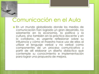 Este documento presenta una secuencia didáctica para mejorar la comunicación en el aula a través de varias etapas: 1) explorar las expresiones de comunicación de los estudiantes, 2) establecer un diálogo sobre las dificultades de comunicación, y 3) implementar dinámicas grupales que fomenten la interacción. También describe las características deseables de un docente orientado a la comunicación efectiva, como ser indagador, expresivo, facilitador y motivador.