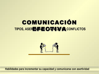 El documento trata sobre la comunicación efectiva y las habilidades para mejorar la capacidad comunicativa y manejar conflictos de manera asertiva. Explica que la comunicación es un proceso dinámico que involucra emisor, mensaje y receptores, y cubre temas como los niveles de comunicación, las barreras, la importancia de escuchar, y técnicas como controlar el lenguaje no verbal y hacer preguntas para mejorar la comunicación y prevenir conflictos.